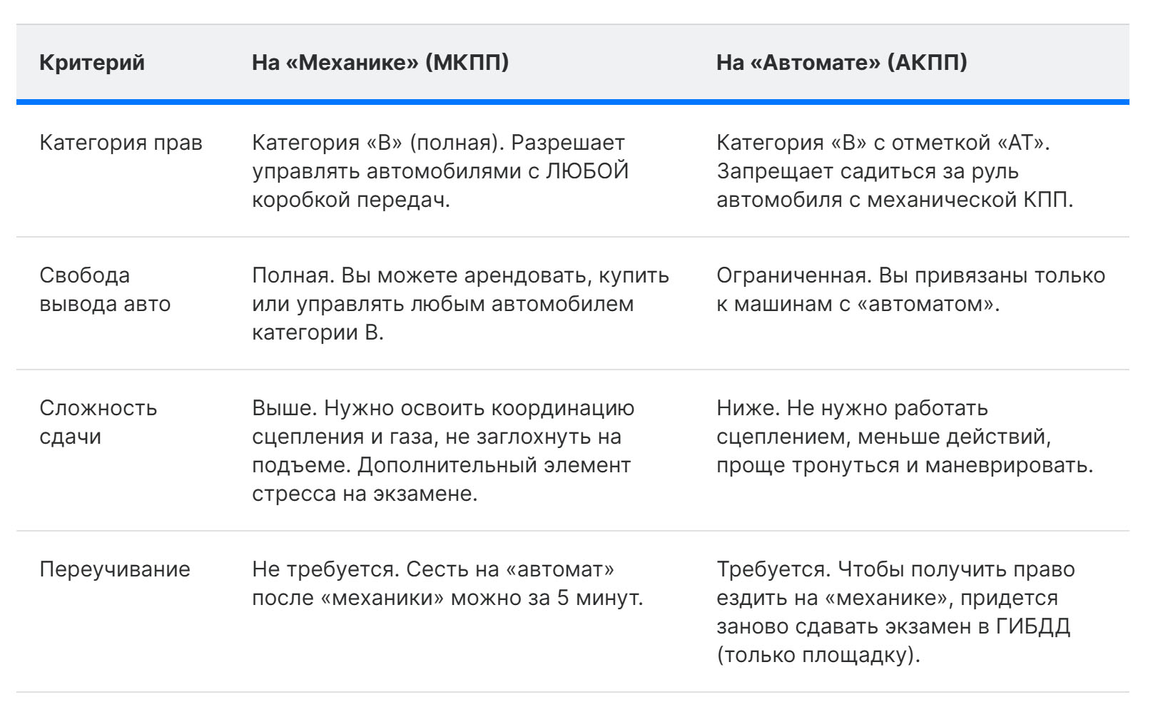 Если вы сдадите на «автомате», в правах будет стоять специальная отметка, и вам будет запрещено садиться за руль машины с «механикой». Это ограничит ваш выбор автомобилей в будущем (при аренде, покупке подержанного авто или поездке с друзьями).